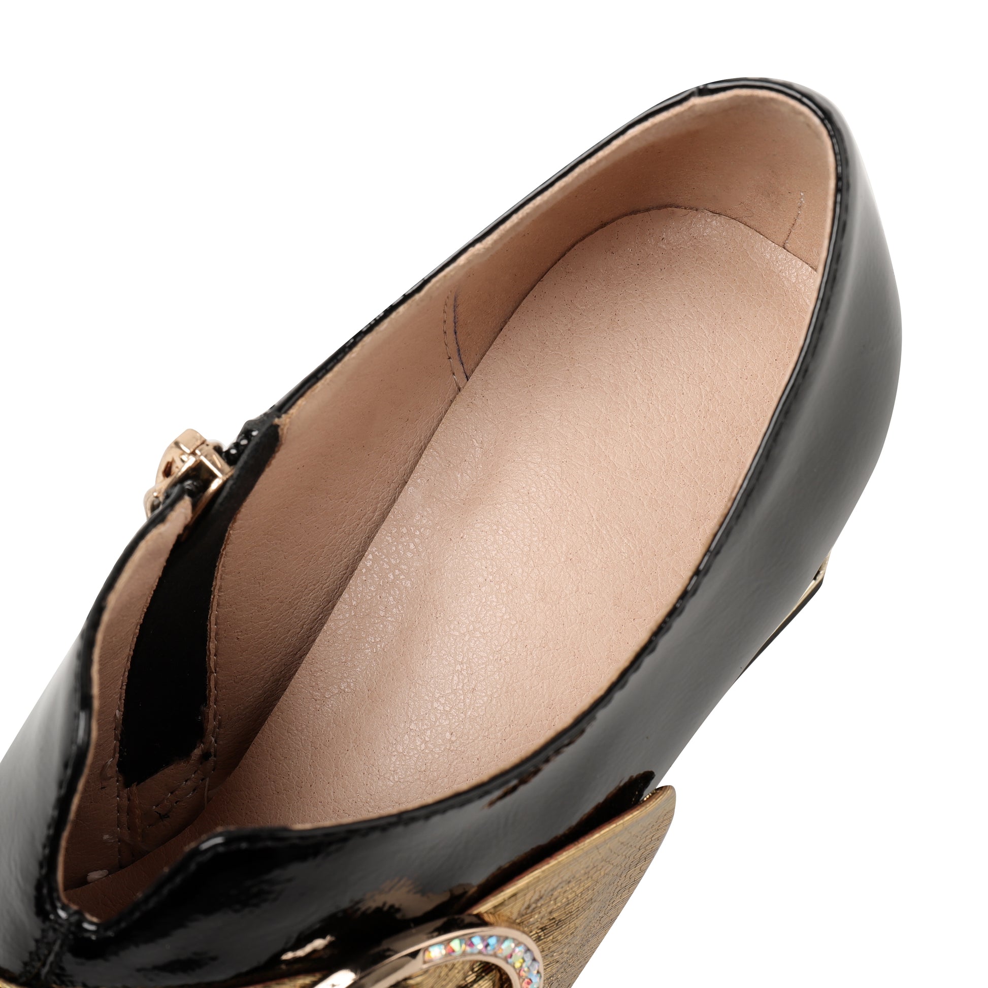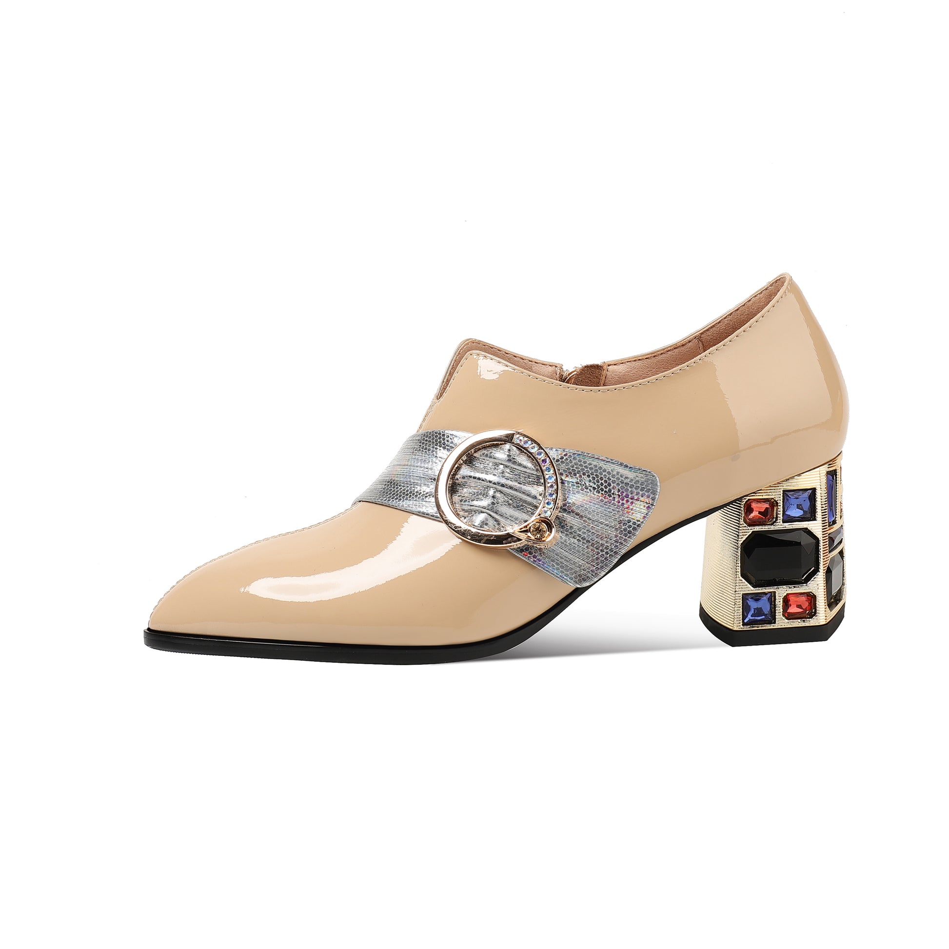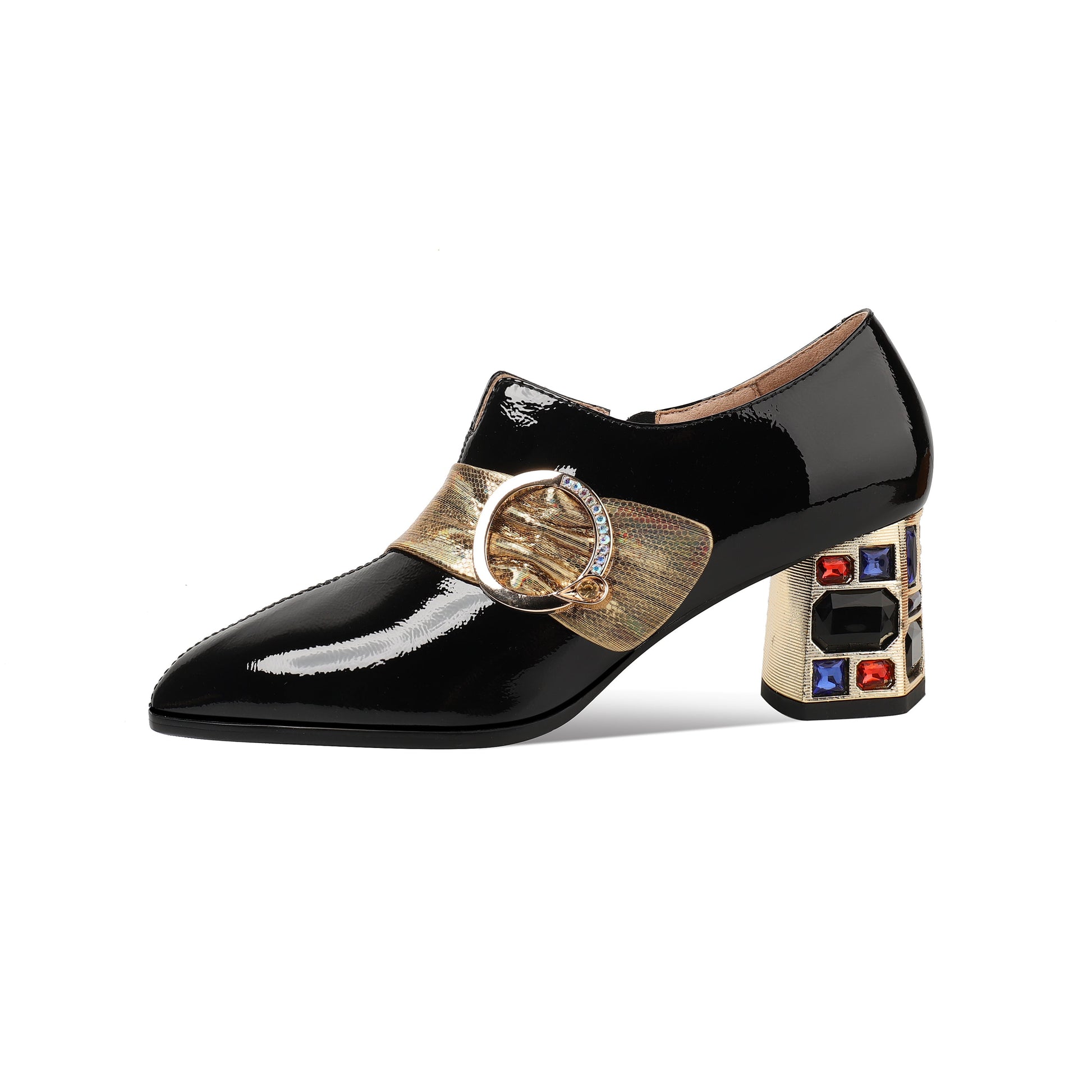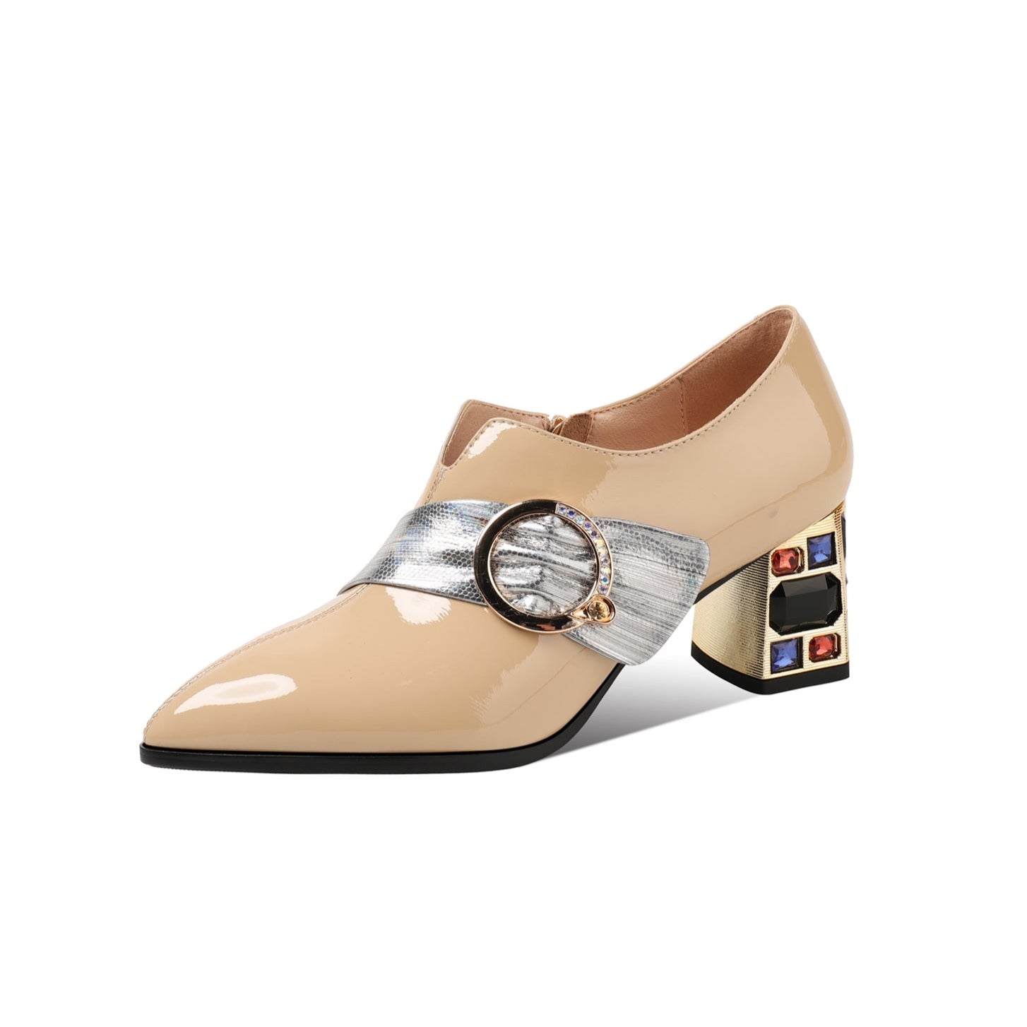 Nine Seven Women's Patent Leather Pointed Toe Side Zipper Handmade Jewelry Chunky Heels Pumps with Buckle